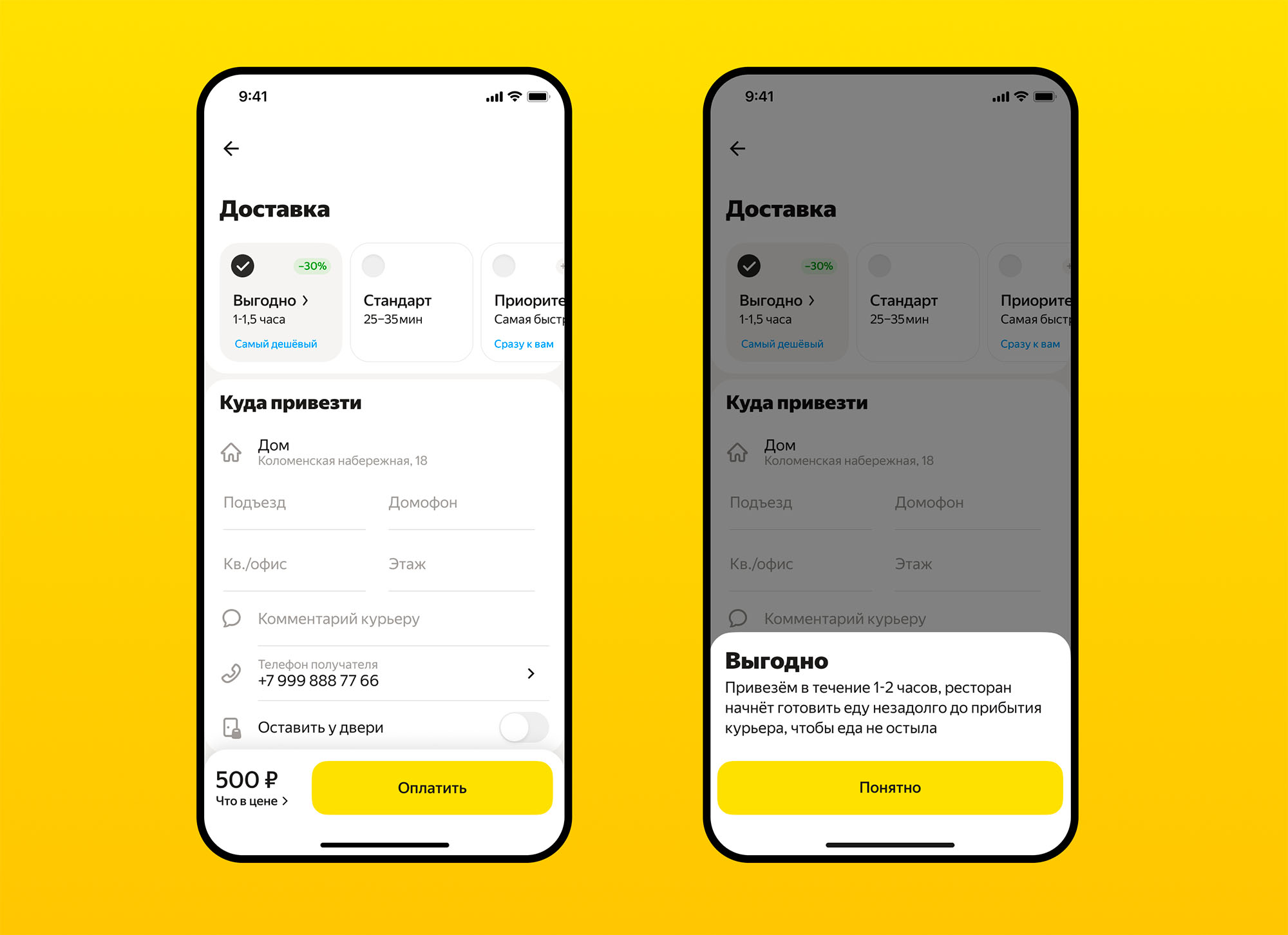 Тариф «Выгодно» действует только в зонах доставки пешими и велокурьерам. На такие районы приходится большинство заказов в сервисе. Когда пользователь выбирает «Выгодно», у Еды есть больше времени, чтобы найти курьера. При этом для курьеров и ресторанов заказ выглядит так же, как и при стандартном тарифе: заведение начинает готовить блюда только после назначения курьера, а значит, еда не остынет в дороге.