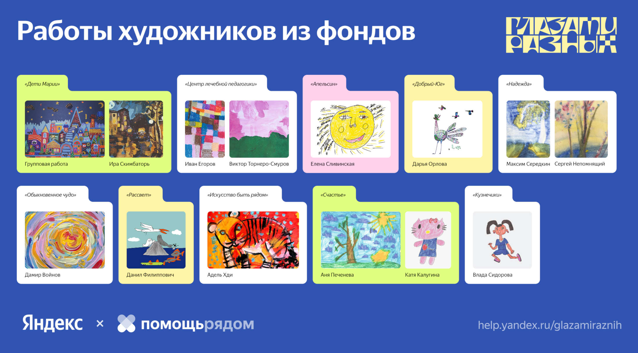 Благотворительный фонд Яндекса «Помощь рядом» и Яндекс Такси в третий раз запускают «Глазами разных» — арт-проект в поддержку людей с особенностями развития. Автомобили партнёров Яндекс Такси и машины Драйва оформят рисунками подопечных благотворительных организаций — в новом сезоне проекта впервые появятся детские работы. «Глазами разных» запустят в семи городах: в этом году к Москве и Санкт-Петербургу присоединились Ижевск, Иркутск, Краснодар, Сургут и Томск.