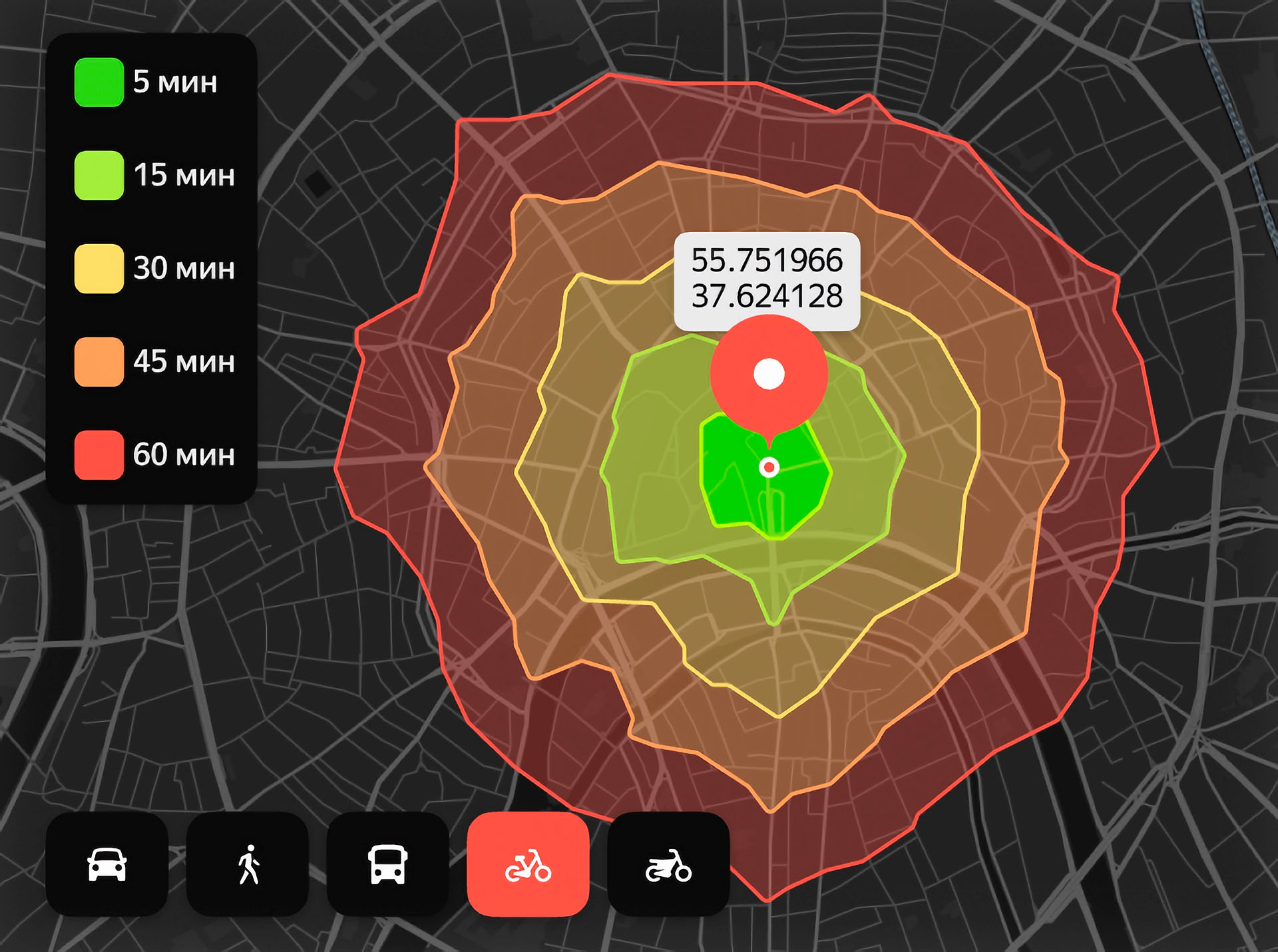 Изохрон API учитывает разные способы передвижения: на автомобиле, велосипеде, общественном транспорте, самокате или пешком. Чтобы построить границы доступной зоны, достаточно указать начальную точку и выбрать подходящий временной интервал — 5, 10, 15 минут и так далее. Для автомобилей доступна зона в пределах часа, для остальных способов передвижения — до 45 минут. Сервис учитывает пробки, прогноз погоды и адаптирует зоны доставки под изменения ситуации на дорогах.