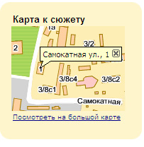Примечание: в этой новости нет ни одного адреса, кроме «интернет». А если бы был упомянут, например, адрес офиса Яндекса в Москве: ул. Самокатная д. 1, то рядом появился бы такой фрагмент карты: