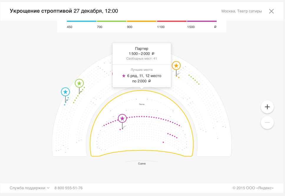 Чтобы выбрать было проще, Яндекс.Афиша автоматически выделяет в каждом ценовом диапазоне два лучших места: сервис учитывает, сколько стоит билет, хорошо ли видно сцену и не закрывает ли что-нибудь обзор — например, колонна.