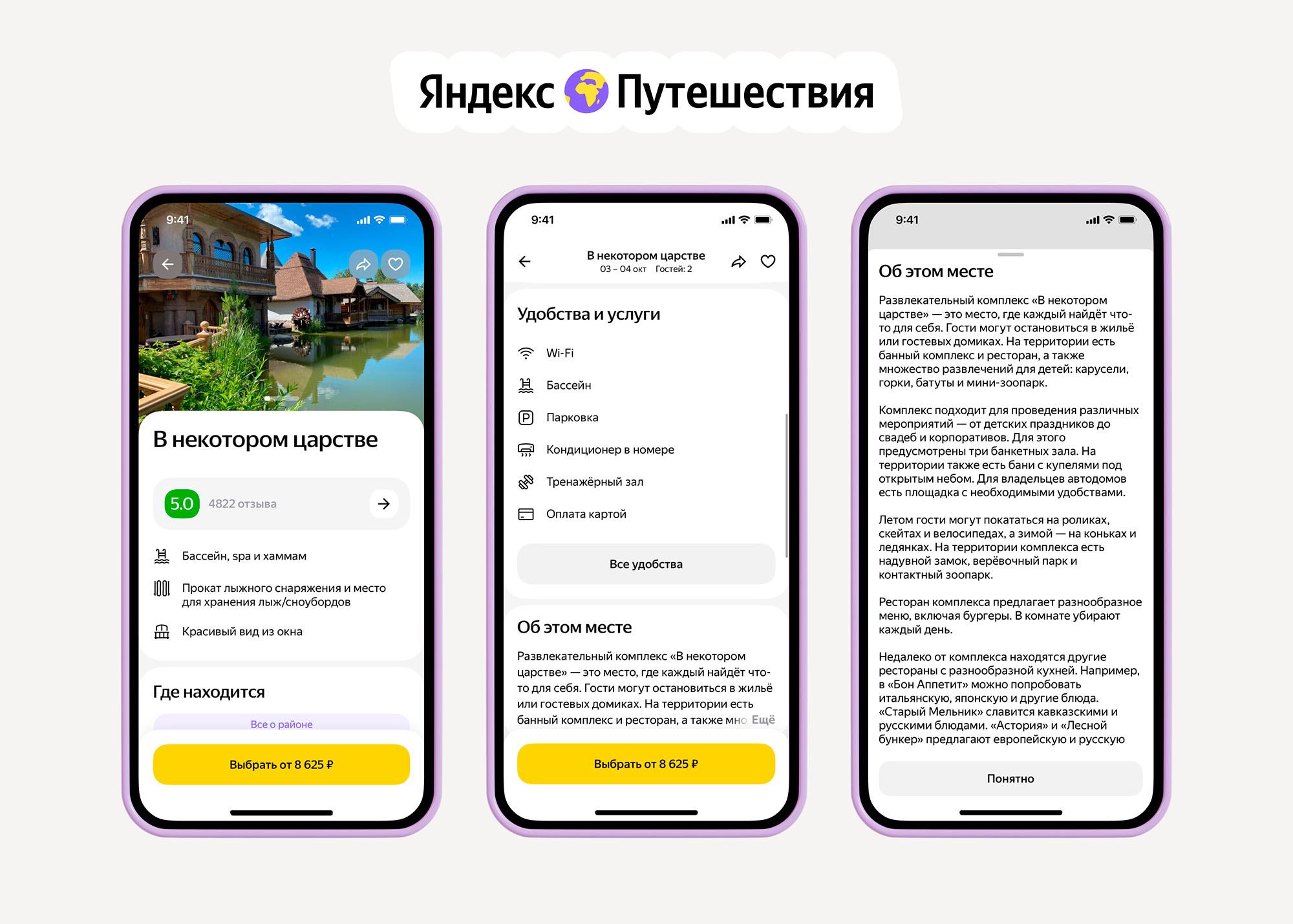 Алиса уже сгенерировала описания для всех российских отелей и апартаментов, доступных на Яндекс Путешествиях. Если владелец обновит данные в Яндекс Бизнесе или Экстранете, автоматически обновится и описание. Корректировки можно внести и вручную — обратившись в поддержку Яндекс Путешествий.