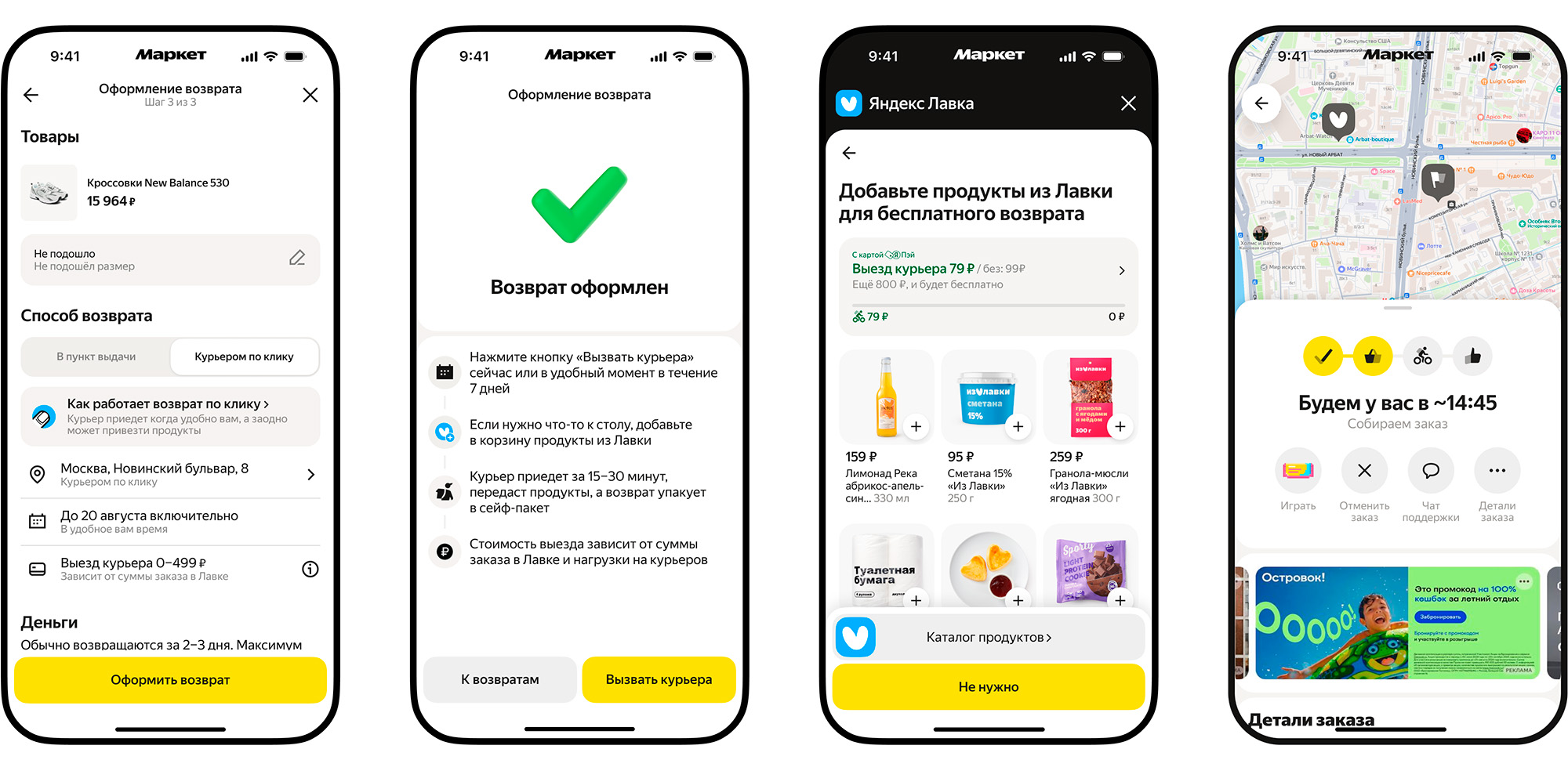 Чтобы вернуть товар, покупателю нужно загрузить фото в приложение и выбрать способ возврата «по клику». Услуга доступна, если адрес находится в зоне работы дарксторов. После этого пользователь может вызвать курьера и сделать заказ в Лавке. Курьер заберёт продукты, привезёт их покупателю и заберёт неподошедший товар с Маркета. Перед этим он проверит и упакует его в защитный пакет. Услуга возврата «по клику» работает в часы работы ближайшего даркстора — они указаны в приложении.