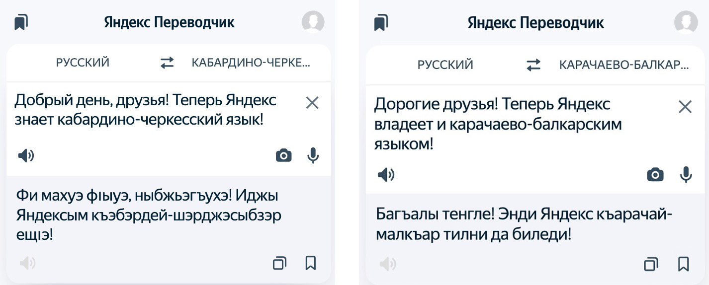 В Яндекс Переводчике появились два новых языка: карачаево-балкарский и кабардино-черкесский. Сервис позволяет переводить тексты с этих языков на более чем сотню других и обратно. Это можно делать на сайте и в приложении Переводчика, а также прямо в поиске.