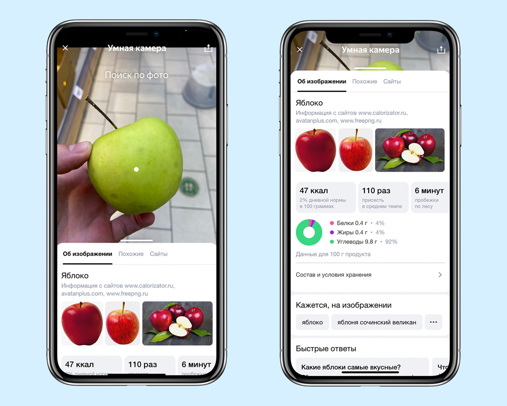 Умная камера улучшила поиск по продуктам питания. Теперь она не только находит их в интернете, но и даёт подробное описание. Стоит навести камеру на пакетик сока или плавленый сырок, и она покажет их состав: количество жиров, белков и углеводов; наличие сахара и ГМО; содержание микроэлементов. А также — сколько в продукте калорий и как долго нужно плыть или бежать, чтобы их израсходовать.