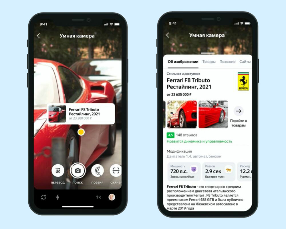 Если навести камеру на автомобиль, она покажет его описание: марку, модель и технические характеристики. Человек сможет понять, что за машина перед ним, какая у неё мощность, скорость и расход топлива. Технические характеристики снабжены коротким и ёмким пояснением: например, «разгоняется как спринтер» или «вместительная, как сундук».