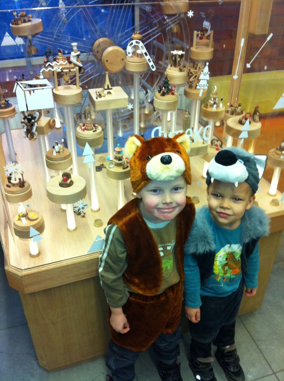 На тот Новый год я пошёл вместе с Аркадием и Степаном, им было пять и три года. Первого я одел в костюм мишки, а второй был волком. Мы зашли в офис «Красной розы» и увидели блестящее колесо, которое вращалось и подсвечивалось. Рядом с ним было много разных фигурок, вокруг миниатюрной Эйфелевой башни летал самолётик, а у Биг-Бена ездила машинка. Выглядело сказочно, поэтому детям очень понравилось.