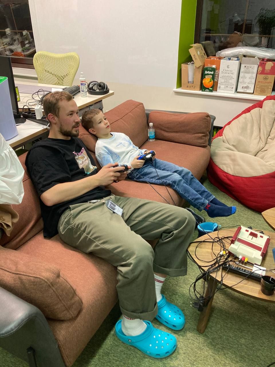 На последний Новый год мы приехали уже со своей приставкой. Я купила себе «Денди», а дома его не подключить: телевизора у нас нет. Поэтому в Super Mario и танчики сын играл в офисе. А компанию ему на этот раз составил мой коллега из HR Tech — Григорий. Они уютно устроились на диване и пару часов не отрывались от экрана.