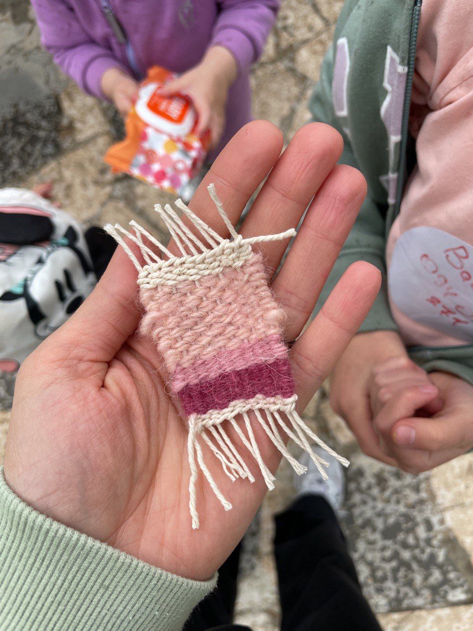 Мы с детьми и женой пекли лаваш, играли в местную разновидность юлы, бадминтон, шили и ткали небольшие коврики. Последние особенно запомнились, потому что это очень медитативное занятие: сидишь, не спеша протягиваешь нить и укладываешь её рядами. Мне не хватило терпения, а вот Софа — старшая дочка — спокойно сидела и плела, хотя по характеру она у нас очень активная.