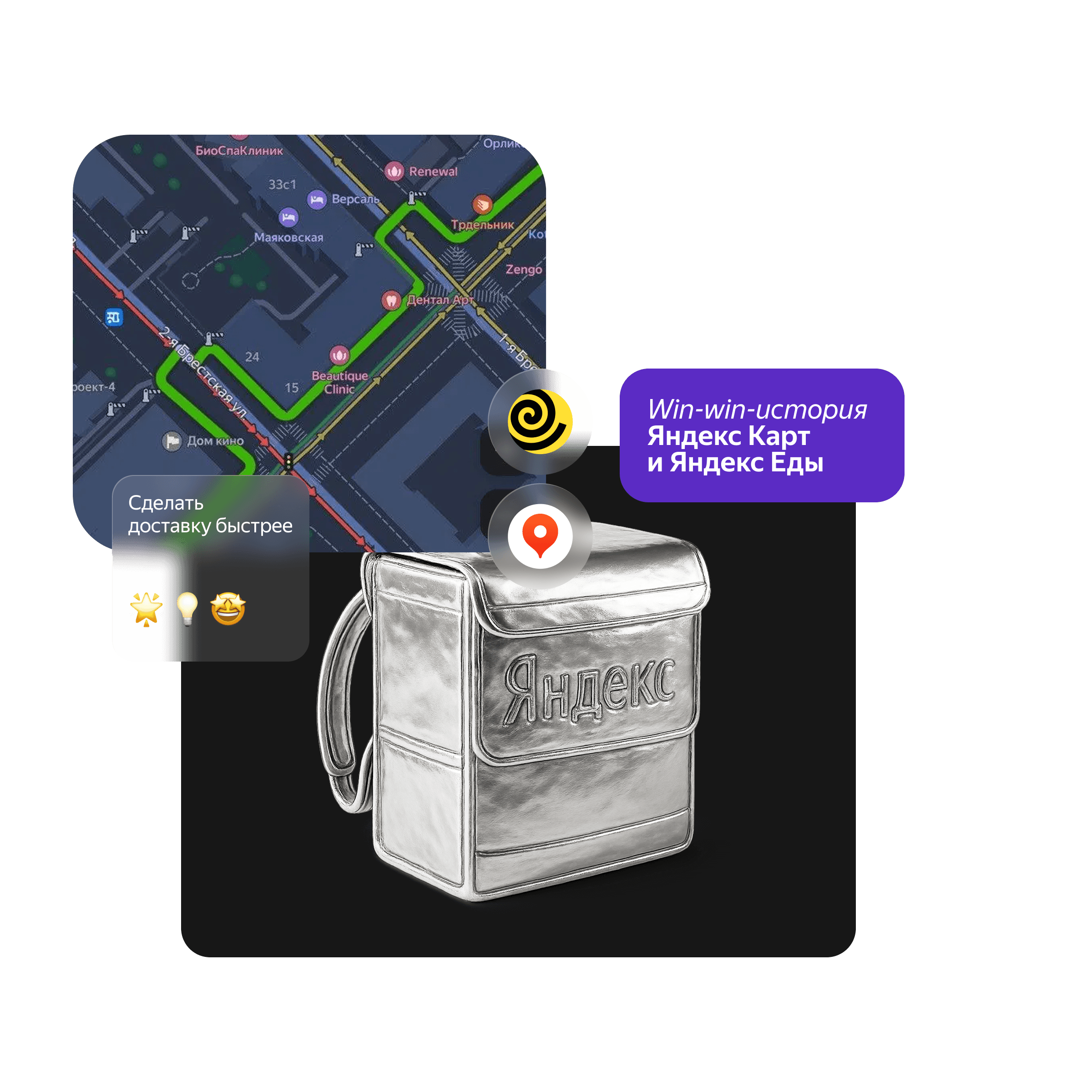 Первым делом мы поставили общую цель — сделать доставку быстрее. Раньше маршруты для курьеров и обычных пользователей строились по одному алгоритму: он учитывал набор критериев, в котором время оценивается наравне с другими факторами, характеризующими комфорт пользователя. Например, если велосипедист строит маршрут до парка, он собирается на прогулку, поэтому сервис может предложить более прогулочный путь вдоль красивой набережной. Курьеру не важны ландшафты и архитектура. Его задача — доставить заказ как можно скорее. Поэтому нам предстояло переработать маршруты из Карт и сделать их максимально быстрыми и удобными для курьеров.