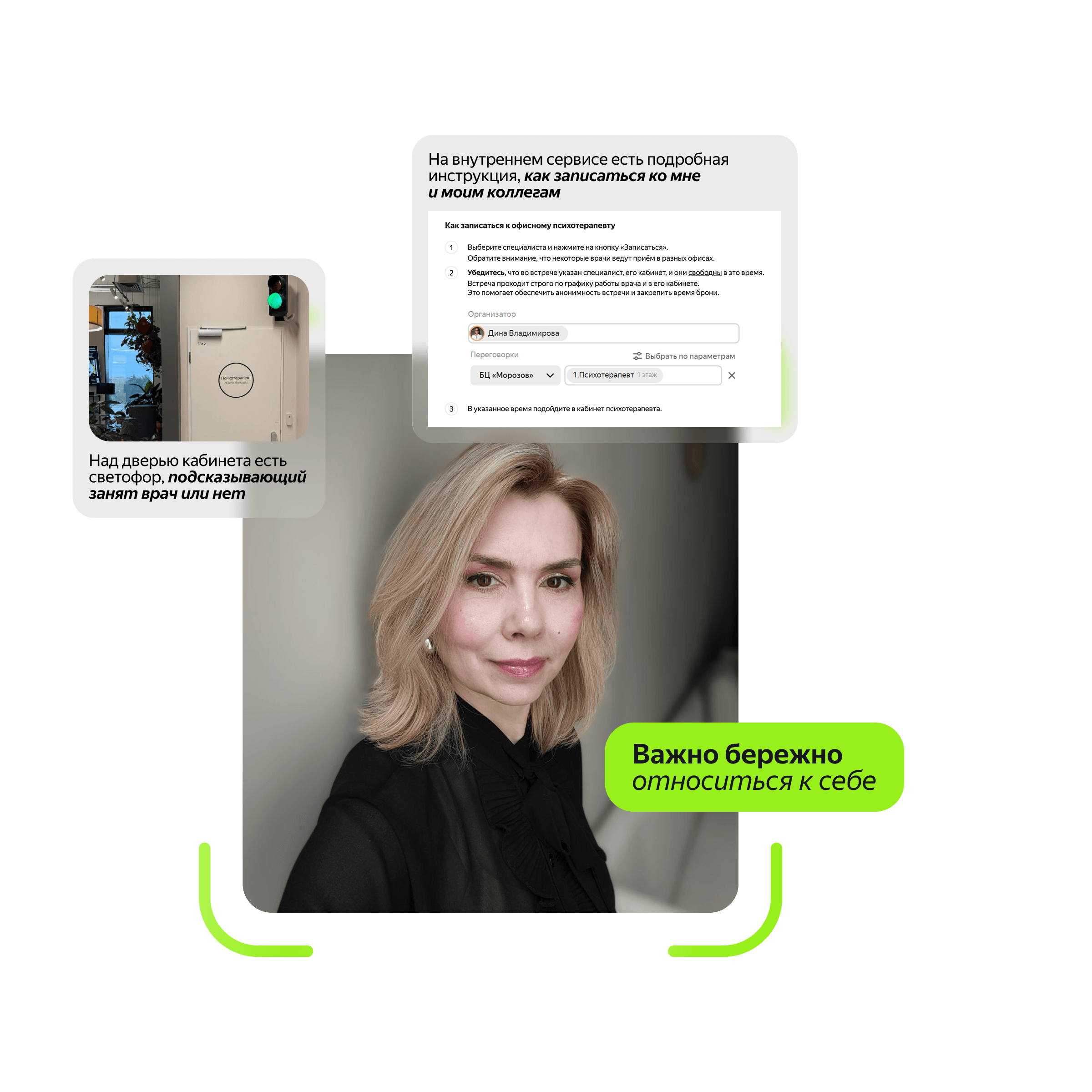 Мой рабочий день в офисах состоит исключительно из встреч с клиентами — сотрудниками Яндекса. Я принимаю очно с 10 утра до 19 вечера, с обеденным перерывом с 14 до 15. Для удобства над дверью кабинета есть светофор, подсказывающий занят врач или нет (зелёный — свободно, красный — занято).