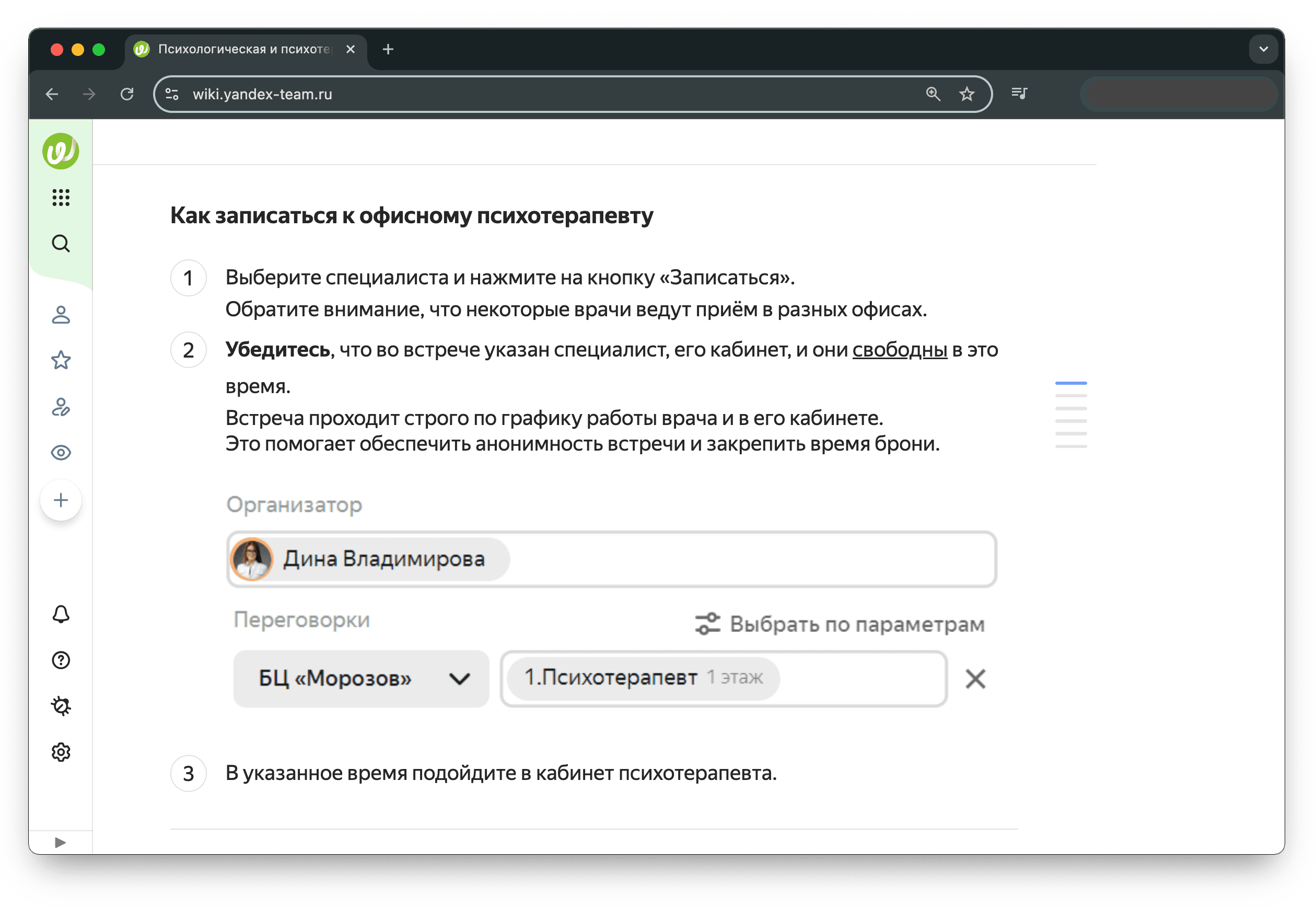 Во внутреннем сервисе есть подробная инструкция, как записаться ко мне и моим коллегам. Там же есть наше расписание и свободные слоты. Поскольку я корпоративный психотерапевт, любой сотрудник Яндекса может записаться ко мне и получить помощь бесплатно по ДМС.